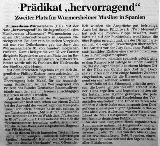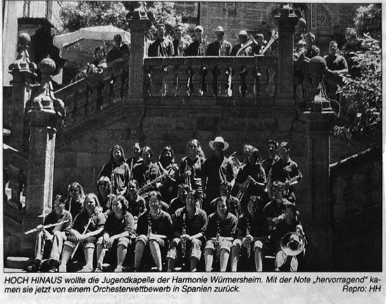 Am Samstag, den 29. Mai 2004 brach die Würmersheimer Jugendkapelle Richtung Spanien auf, um dort neue musikalische Erfahrungen zu sammeln. Unsere Vorfreude wurde allerdings nach 14 Stunden Busfahrt, rund eine Stunde vor unserem Ziel, drastisch getrübt: verweigerte doch der 4-Sterne-Bus auf einem Rasthof kurz hinter der spanischen Grenzen seine Dienste! So kam es, dass wir insgesamt vier Stunden auf einen Ersatzbus warten mussten, wodurch unsere Nerven bereits vor der Ankunft in Calella bis zum Anschlag strapaziert wurden.
