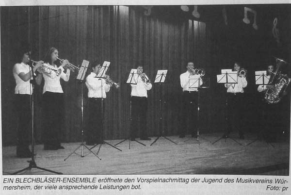 Den krönenden Abschluss bestritten die Schüler- und Jugendkapelle. Peter Dunz und seine Schützlinge zeigten mit den Stücken “Radler in Moskau”, “www.bandtime.com”, “Holzschuhtanz” und “Musikfabrik”, welche Fortschritte sie in den zurückliegenden Monaten erzielen konnten. Wie immer meisterte die Schülerkapelle diese Aufgabe mit Bravour und wurden vom Publikum auch mit dem entsprechenden Applaus belohnt. Die Jugenkapelle begann ihre Darbietung unter der Leitung von Oliver Forster mit “Live und let die” von Paul McCartney. Die Solostimme an der Trompete meisterte Fabienne Haupt. Mit “Atlantic Avenue” und dem neu einstudierten Stück “Contrasts of live” rundete die Kapelle einen herausragenden Vorspielnachmittag auf höchstem Niveau ab. Zum Schluss dankte Jugendleiter Philipp Kistner allen Jungmusikern, Ausbildern, Ensembleleitern, Dirigenten, Kuchenspendern, Helfern und dem Publikum für die hervorragenden Darbietungen und den reibungslosen Verlauf des Vorspielnachmittags 2006.