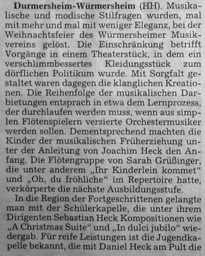 Am Samstag, den 15.12.2007 fand im Gemeindezentrum Würmersheim unsere Weihnachtsfeier 2007 statt. Viele verschiedene Gruppierungen hatten sich in den Proben intensiv auf diesen Abend vorbereitet. Den Beginn machten unsere Jüngsten- die Kinder aus der musikalischen Früherziehung unter der Leitung von Joachim Heck. Begleitet von einer Bläsergruppe führten sie das Stück “Die Wahl zum Tier des Jahres Null” auf. Schon hier wurde deutlich, dass sich einige Kinder darunter befinden, die die Musik im Blut haben. Voller Inbrunst spielten und sangen sie und erhielten dafür hinterher auch den gebührenden Applaus.