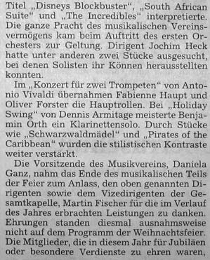 Danach war die Bühne frei für die Kinder der Flötengruppen unter der Leitung von Sarah Grüßinger. Diese beiden Gruppen stimmten mit ihren dargebotenen Weisen auf Weihnachten ein. Anschließend konnten die Schülerkapelle unter der Leitung von Sebastian Heck und die Jugendkapelle unter der Leitung von Daniel Heck ihr Können unter Beweis stellen. Den Registerpokal der Jugendkapelle erhielt dieses Jahr das Schlagzeugregister und in der Einzelwertung waren Lukas Stürmlinger und Linda Stürmlinger die fleißigsten Probenbesucher. Den Abschluss des musikalischen Teiles der Weihnachtsfeier gestaltete die Gesamtkapelle unter der Leitung von Joachim Heck. Als Solisten sind besonders Fabienne Haupt und Oliver Forster an den Trompeten und Benjamin Ort an der Klarinette zu erwähnen.