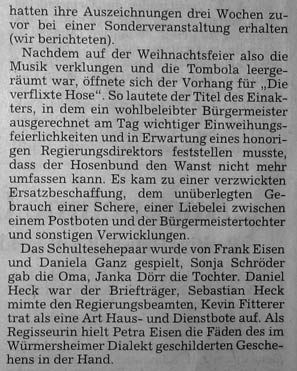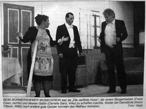 Dass die Musiker nicht nur Musik machen können, bewies dann die Theatergruppe des Vereines. Die “Schauspieler” unter der Leitung von Petra Eisen hatten mit dem Stück “Die verflixte Hose” wieder einmal die Lacher auf ihrer Seite.