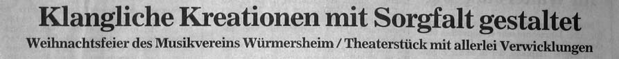 Wie man sieht, war das Programm der Weihnachtsfeier sehr abwechslungsreich und wir möchten uns an dieser Stelle noch einmal ganz herzlich bei allen Gästen für Ihr Kommen bedanken. Den vielen Helfern danken wir für ihren Einsatz an diesem Abend, den Mitgliedern für ihre Gaben für die Tombola und dem Obst- und Gartenbauverein Würmersheim für den schönen Blumenschmuck. Ein besonderer Dank geht auch an die Familie Rauch, die an diesem Abend die Bewirtung übernommen hat. Nicht vergessen wollen wir auch allen Aktiven dieses Abends für ihren Probeneinsatz des gesamten Jahres zu danken. Ohne ihren Probenbesuch und die Bereitschaft zum Üben könnte solch eine Veranstaltung gar nicht stattfinden.