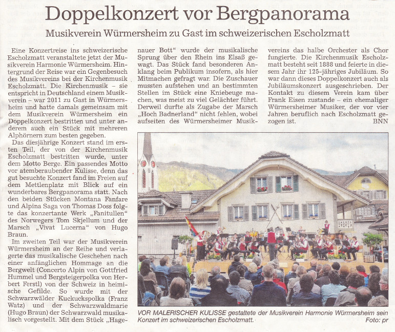 Toll war’s! Da fahr’n wir wieder hin! Da sind sich alle Musiker einig, als sie auf die Vereinsreise am letzten Wochenende angesprochen werden. Egal ob im Hotel untergebracht, in Privatunterkünften oder in der Sammelunterkunft in einem alten Bunker (ja, ja richtig gehört!), konnten wir die schweizer Herzlichkeit und Gastfreundschaft genießen. Auf unserem Programm standen - neben den geselligen Stunden mit unseren Schweizer Musikfreunden – ein Besuch einer Keksfabrik, sowie eine schweißtreibende Wanderung auf Marbachegg. Das Highlight der Reise war jedoch sicherlich das Platzkonzert am Samstagabend vor dem unglaublichen Bergpanorama in Escholzmatt, welches wir gemeinsam mit der Kirchenmusik bestritten haben. Auch diesen Abend haben wir alle gemeinsam mit schweizer Spezialitäten und Musik ausklingen lassen und die deutsch- schweizer Freundschaft ausgiebig gepflegt. Wir bedanken uns an dieser Stelle noch einmal bei allen passiven Mitgliedern, die als Fanclub mit dabei waren, dem Orga-Team und selbstverständlich bei unseren Schweizer Musikfreunden für die reibungslose Organisation und die Gastfreundschaft! Wir freuen uns schon heute auf das nächste Treffen - egal ob in der Schweiz oder wieder bei uns.